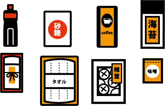 たとえばバスタオルや緑茶、砂糖、コーヒーセット、椎茸、醤油、のり、味噌など、